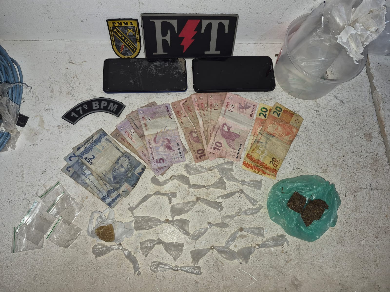 Ainda conforme o relato, parte da droga foi encontrada espalhada no local onde os suspeitos estavam inicialmente, enquanto outra quantidade foi localizada dentro da residência onde eles haviam entrado. Dois aparelhos celulares também foram apreendidos. Segundo os próprios conduzidos, os dispositivos teriam sido recebidos como pagamento pela venda de drogas.