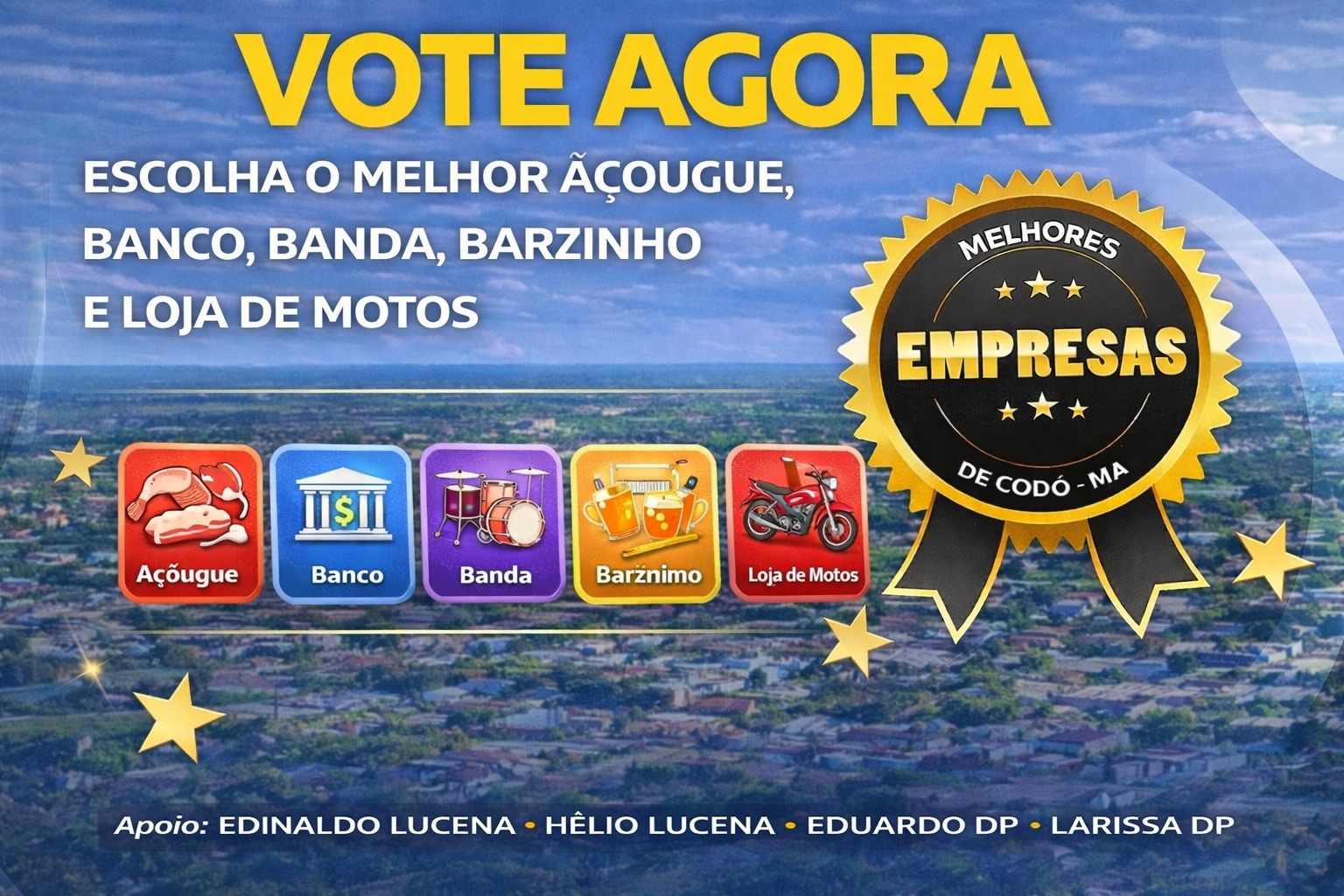 A votação popular e o evento de entrega dos prêmios contam com o apoio de Edinaldo Lucena, Hélio Lucena, Eduardo DP e Larissa DP, reforçando a credibilidade da premiação e valorizando os empreendimentos que contribuem para o desenvolvimento econômico e cultural de Codó.